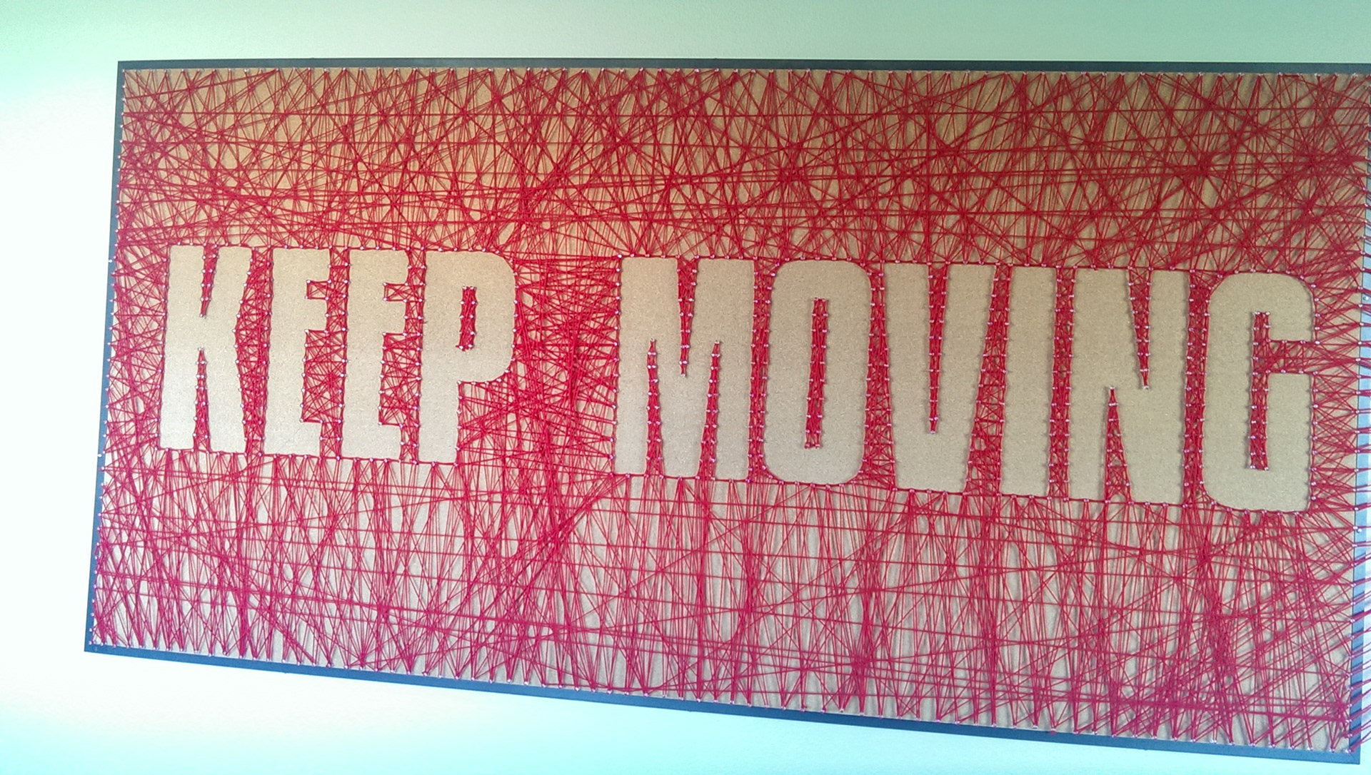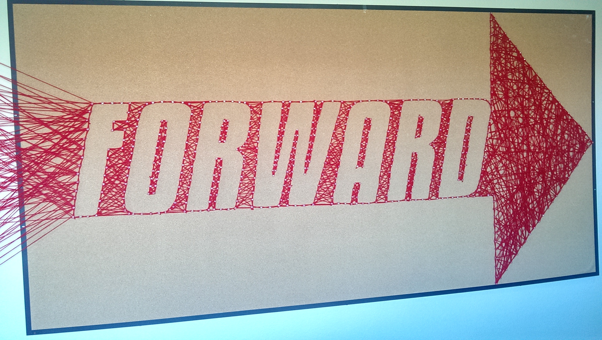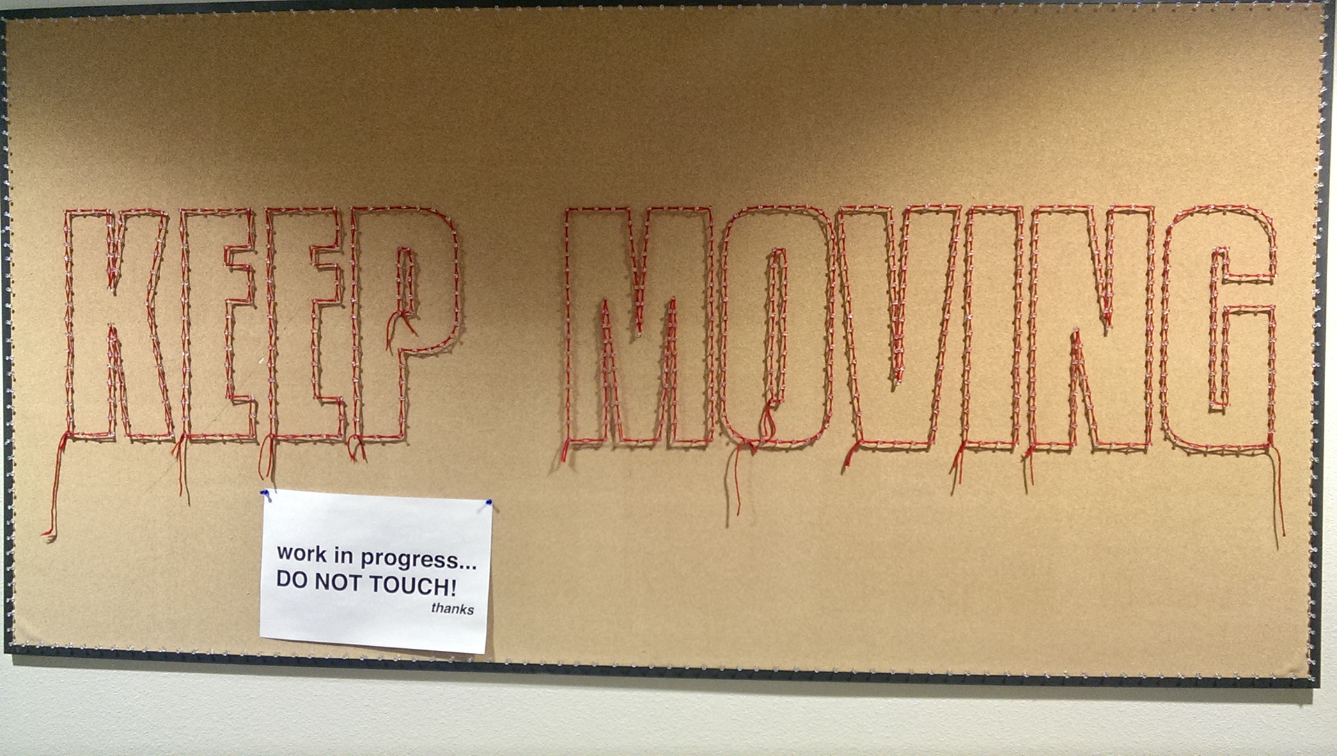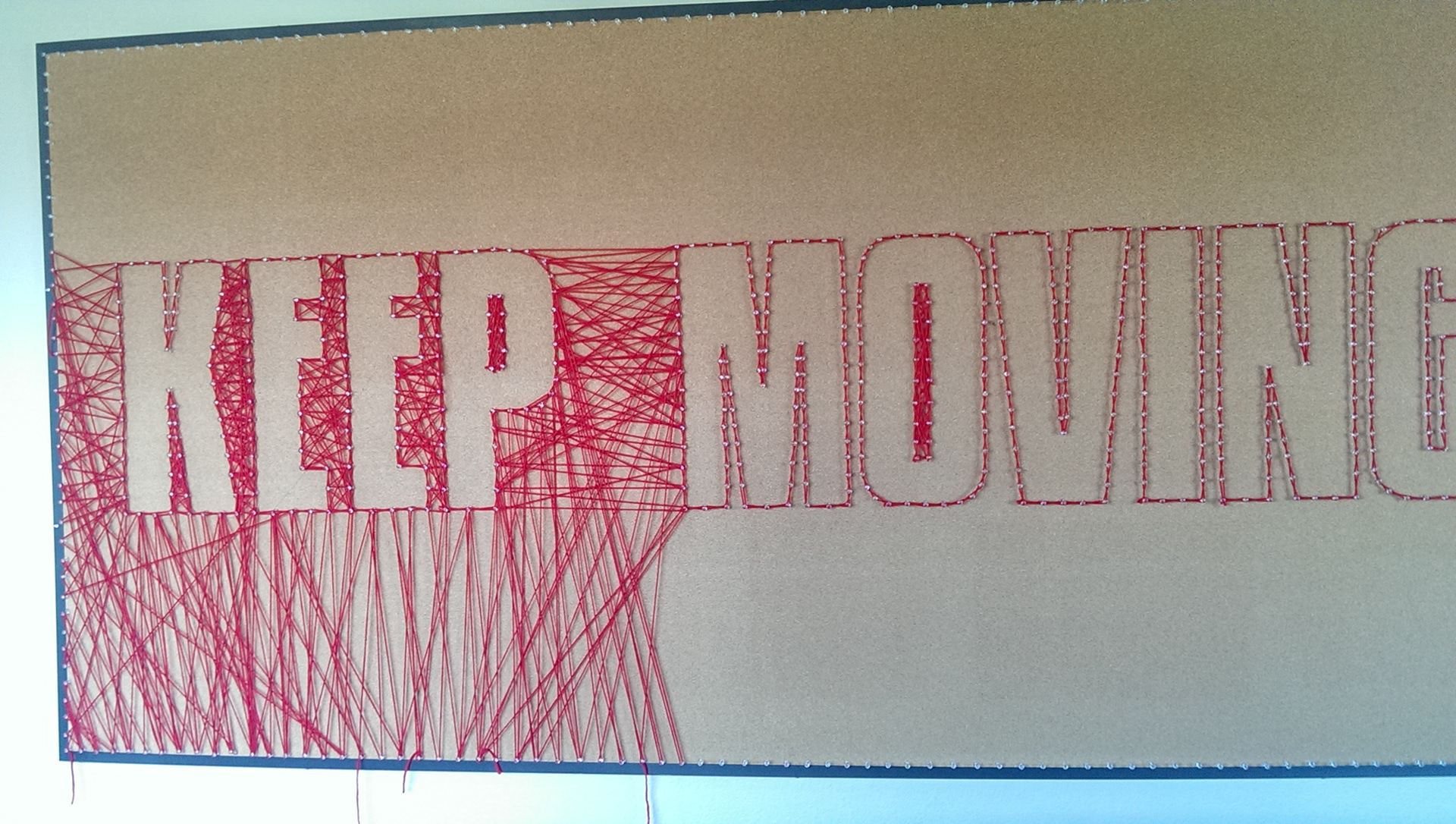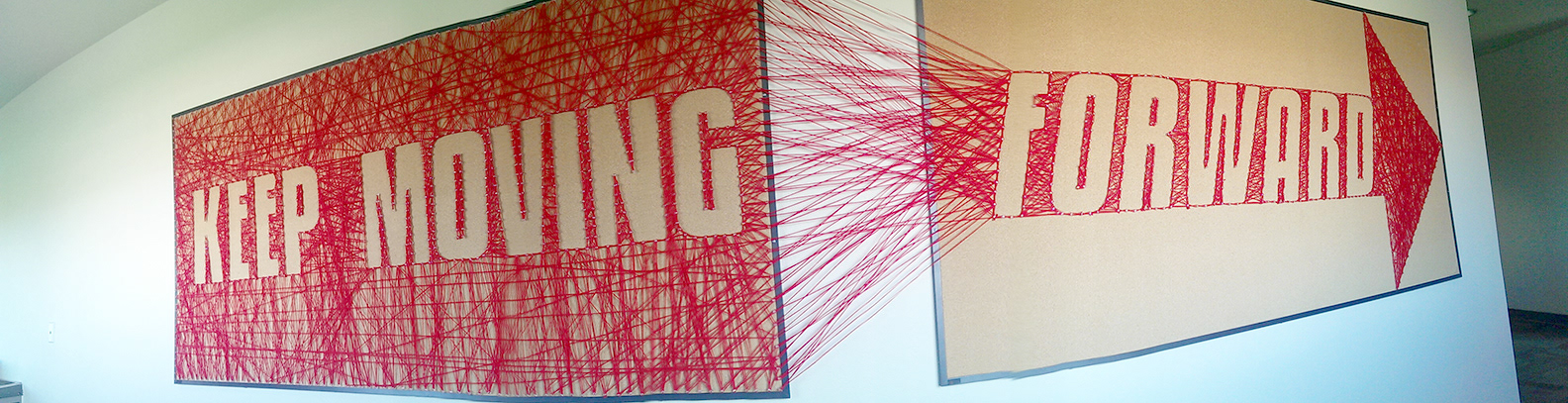 Keep moving forward, words taken from Walt Disney. This is an exparimental typogarphy piece using a lot of yarn and over 1000 pins.